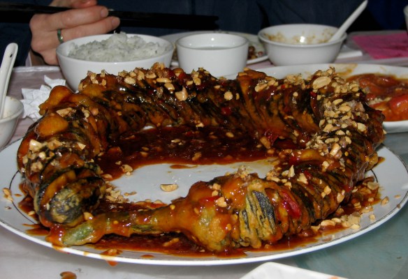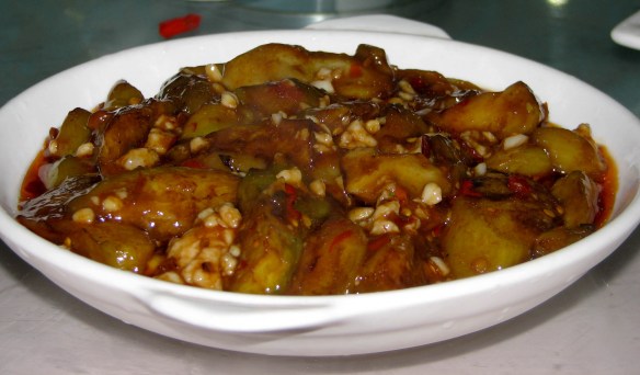 I don’t know the origin of the eggplant dish below, but I have only found it at one very small restaurant in Nanjing. It is truly delicious—spicy, sweet, and crunchy.