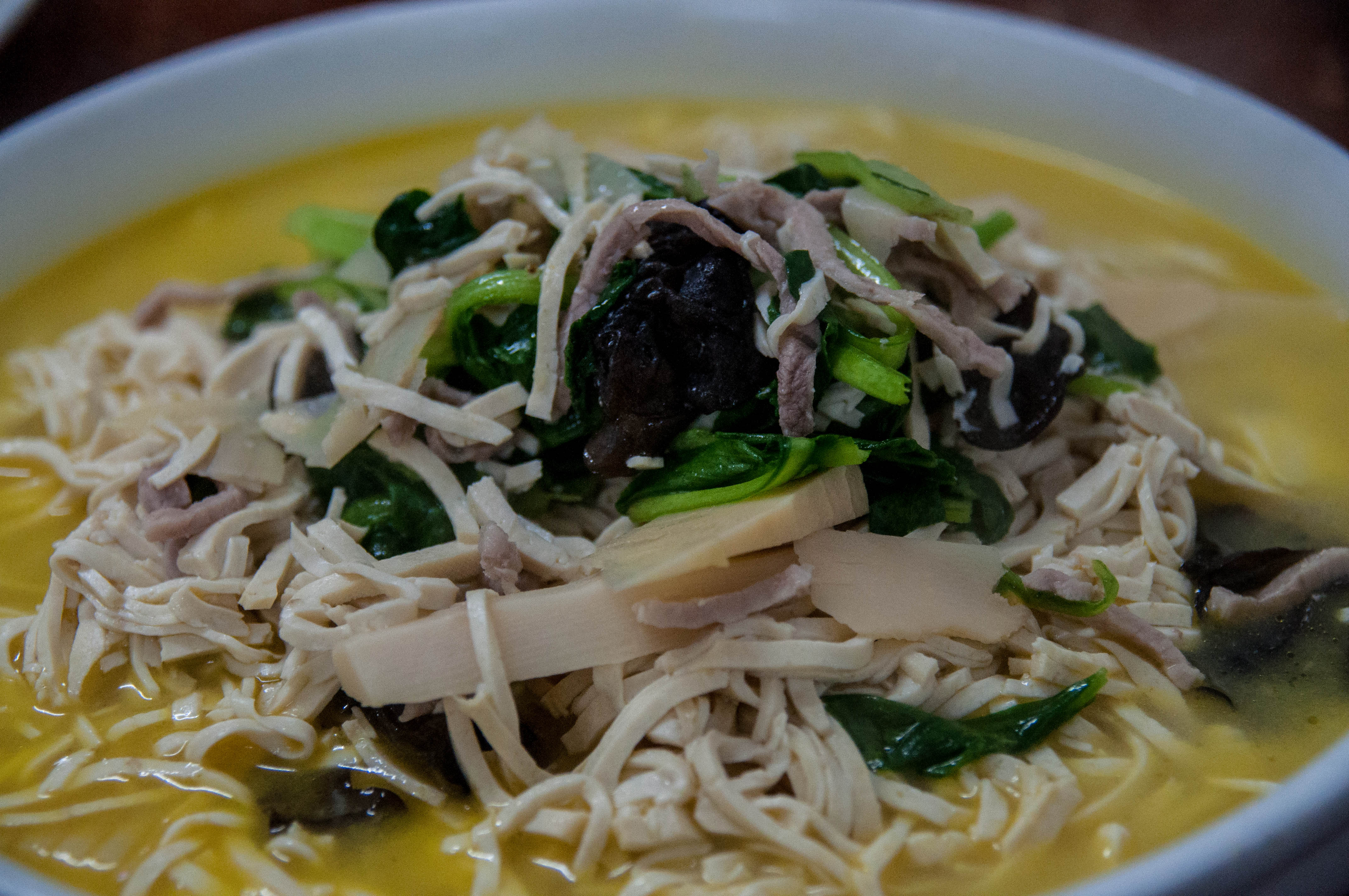 This is another famous Yangzhou dish. The noodle-looking things are actually a type of dried tofu called 豆腐干 dòufugān, which literally means “dry tofu.” It has a firm, chewy texture similar to noodles. Like all tofu dishes the tofu soaks up all the flavors it is mixed with. This dish contains some greens and bamboo shoots all cooked in a delicious, light chicken based stock. It is a wonderful dish and can be found all over Yangzhou.
