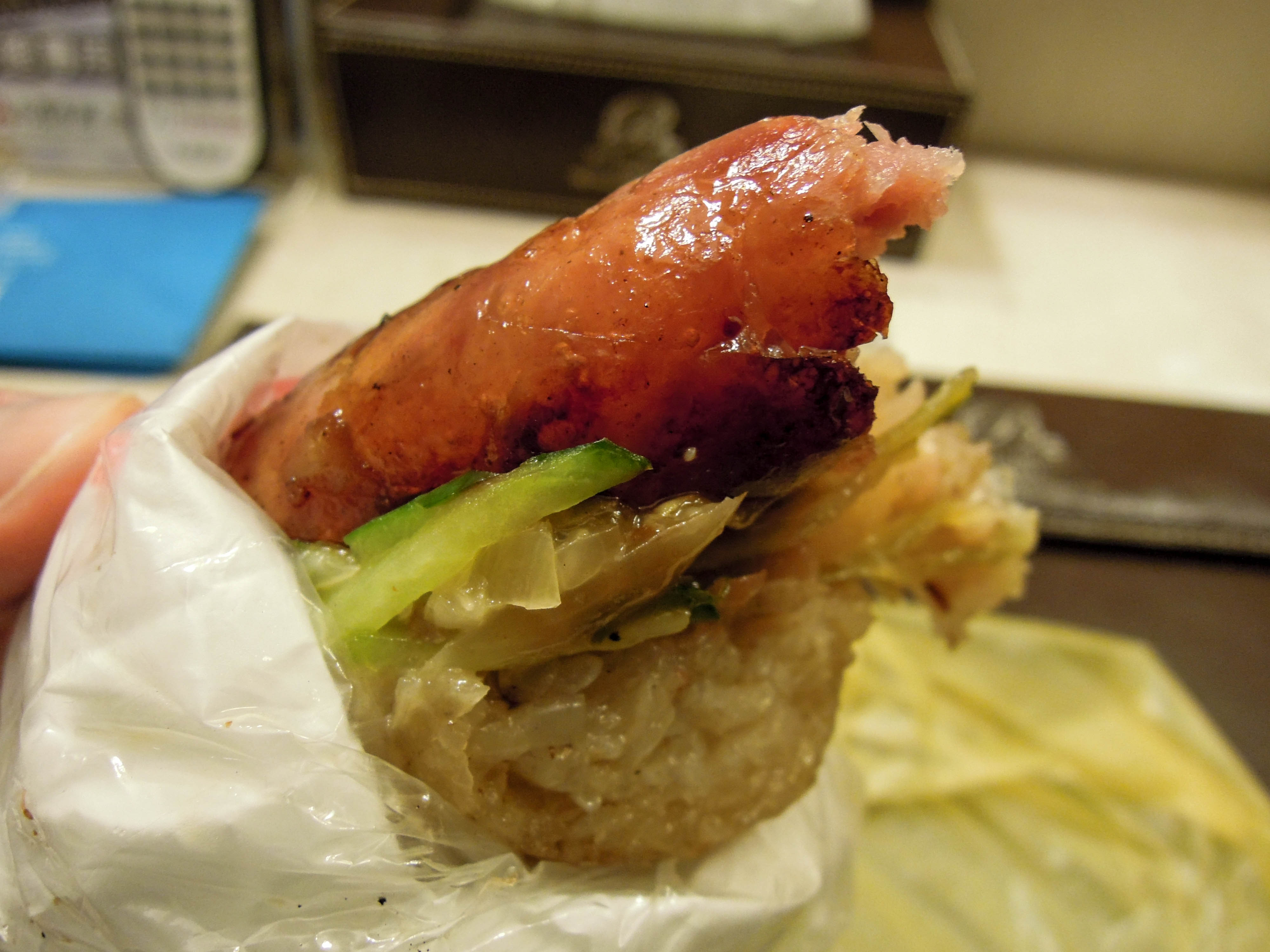 大腸包小腸 dàcháng bāo xiǎocháng ; Small sausage wrapped in a large sausage; the big sausage, which acts as a bun is actually sticky rice in a sausage casing.