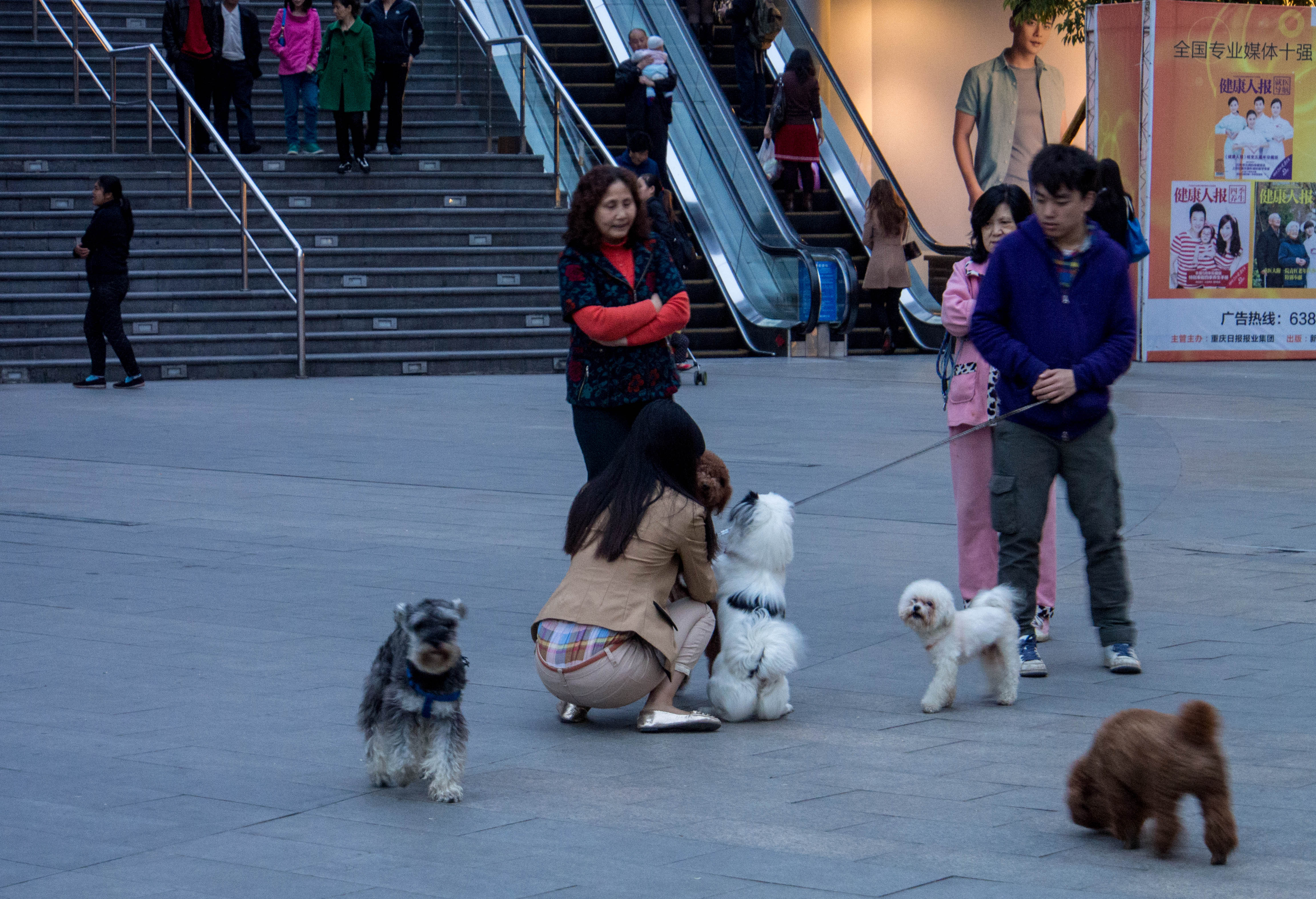 In traditional China pets generally consisted of crickets and birds. Now everyone wants a dog, and there are dogs all over the place. The Chinese not only like to walk them, but they like to congregate in public squares where they can socialize and let their dogs play together. Though many people like small dogs, especially the puffy poodle types, I have also seen many large dogs including Huskies, Labs, Golden Retrievers, German Shepherds, and so on. Having a dog for a pet is a sign of affluence in China. It says, “Hey, I can not only feed myself and my family, but I can also feed a dog and I have time to take care of it.”