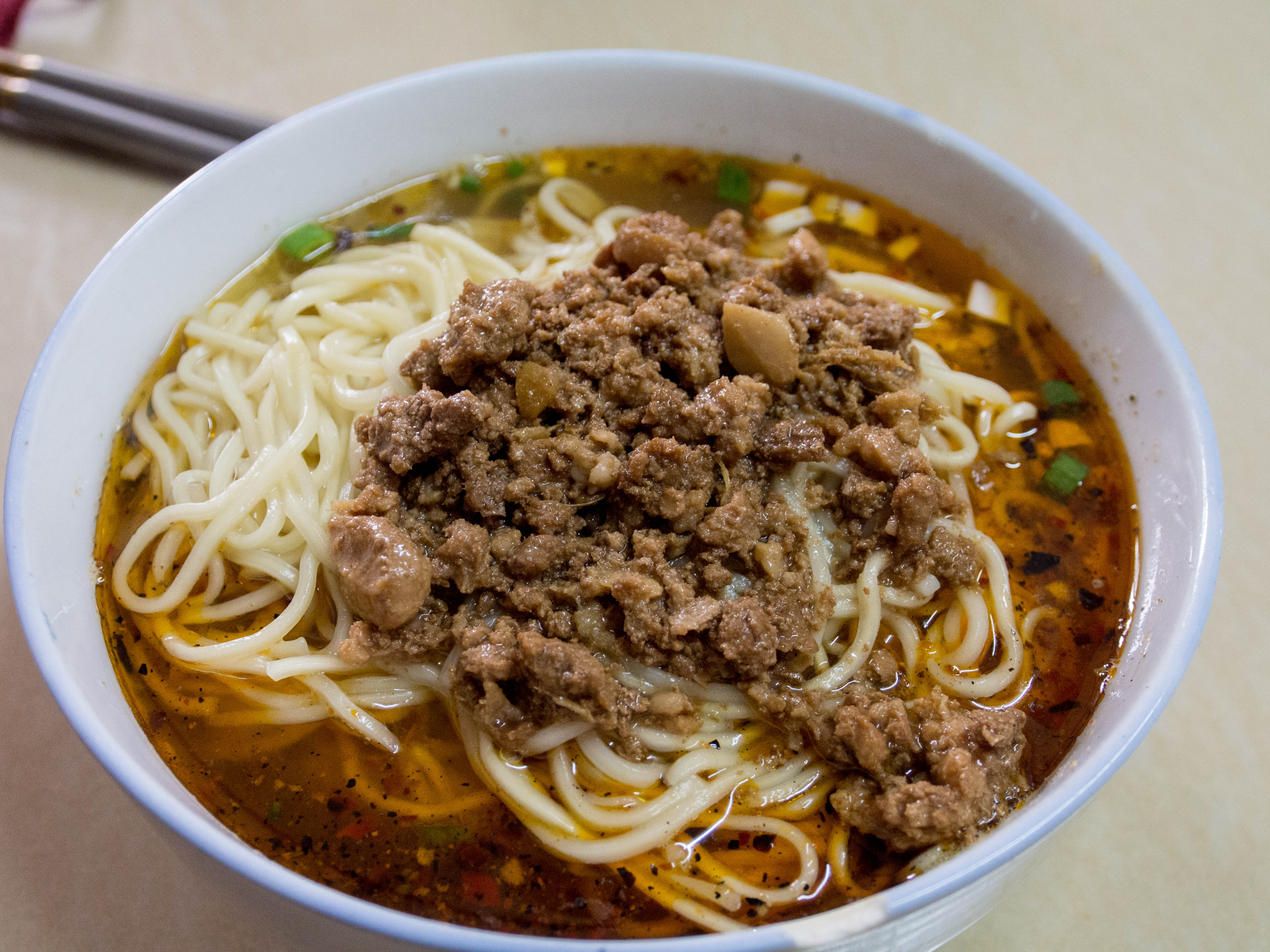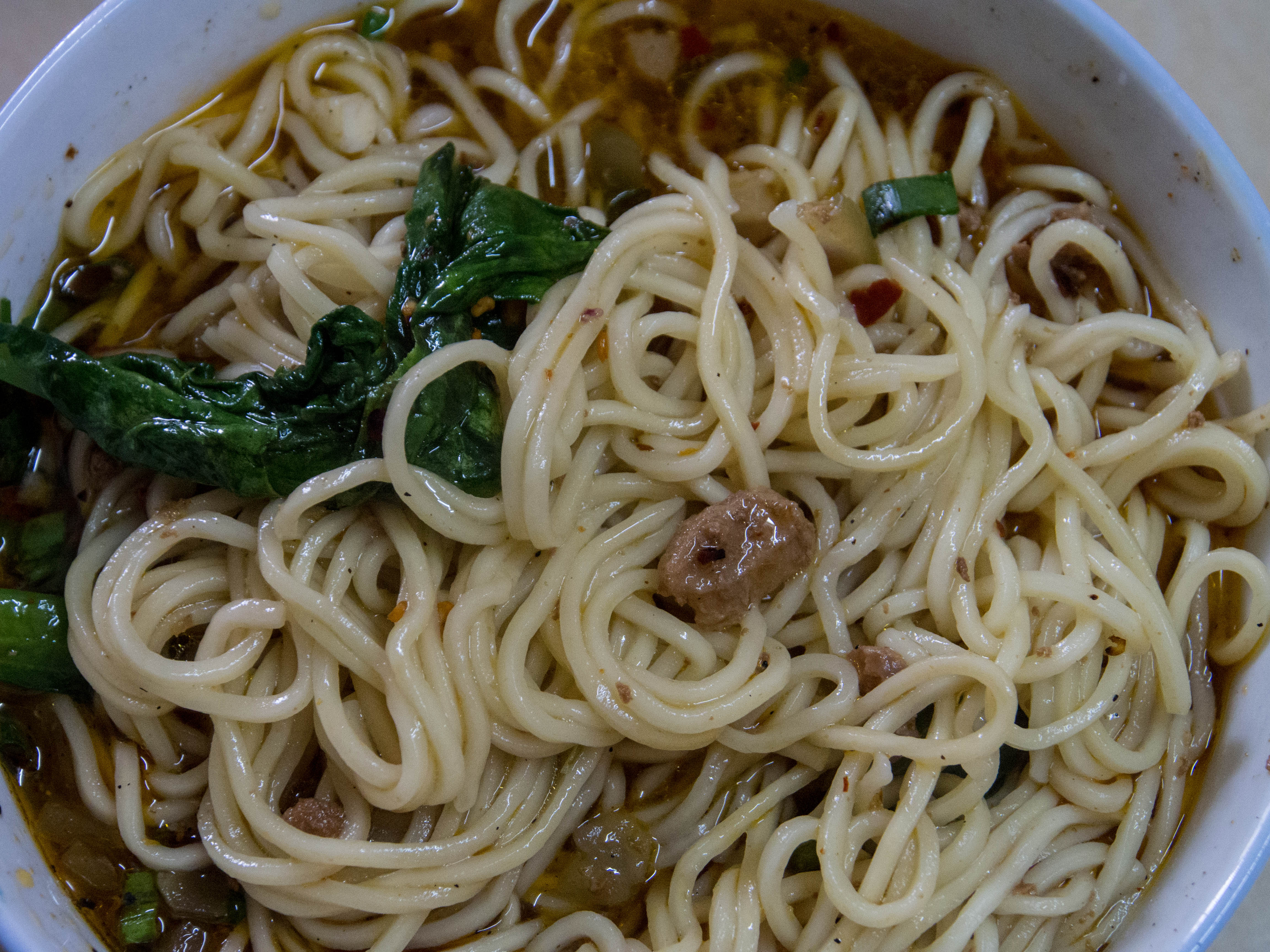 The broth was deep, spicy, rich, and flavorful. Most of the spice was from chili peppers, though there was just a hint of Sichuan pepper. It also contained chopped scallion, garlic, ginger, and oil. It was the kind of broth that you must drink down after you have finished the noodles; that is, if you could after eating the noodles.